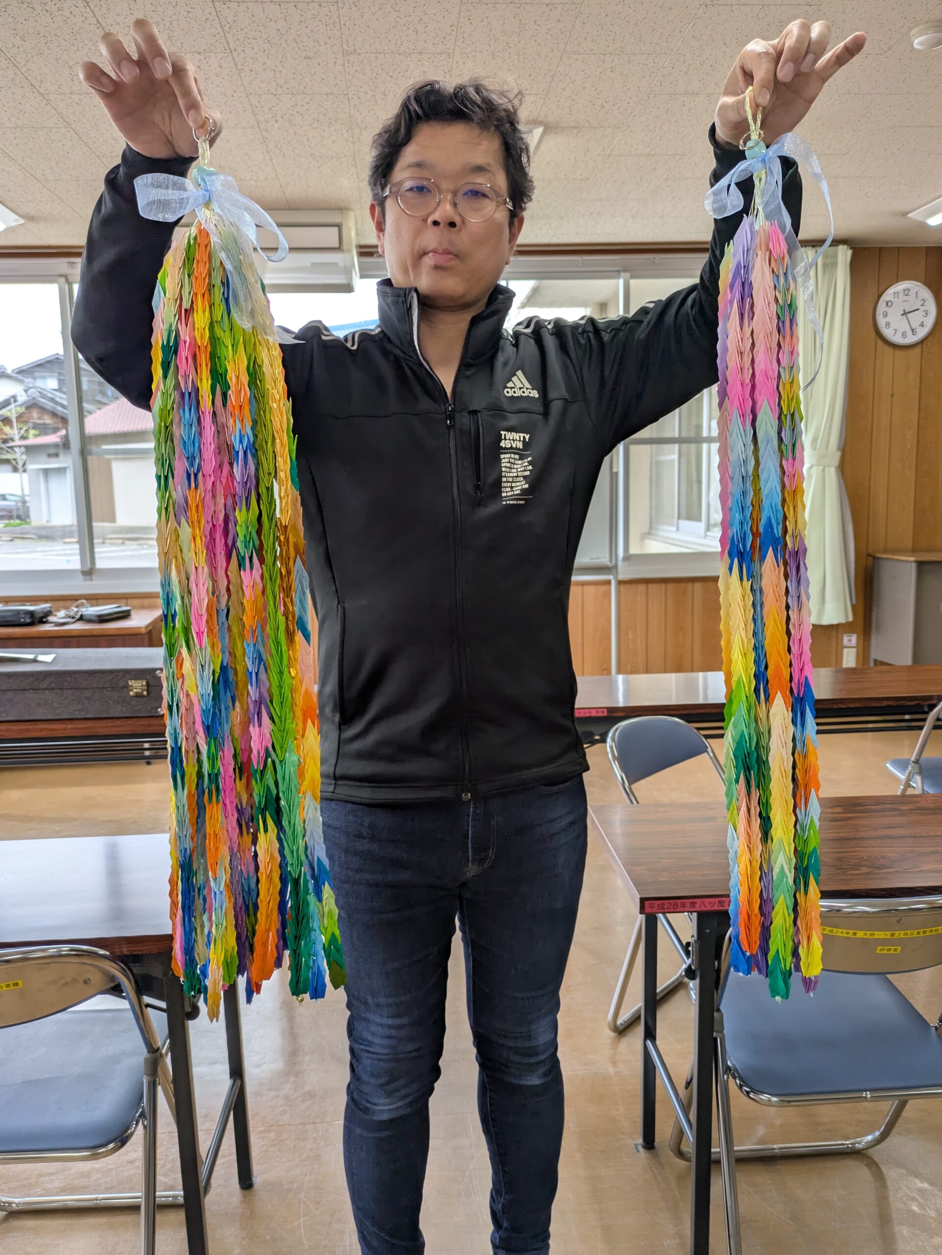 渡す本人は図らずも折り紙の先生。。上手ではないですが沢山の仲間の気持ちがこもっています。